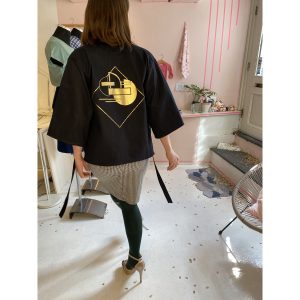 Blacke cotton kimono jacket with golden geo print.