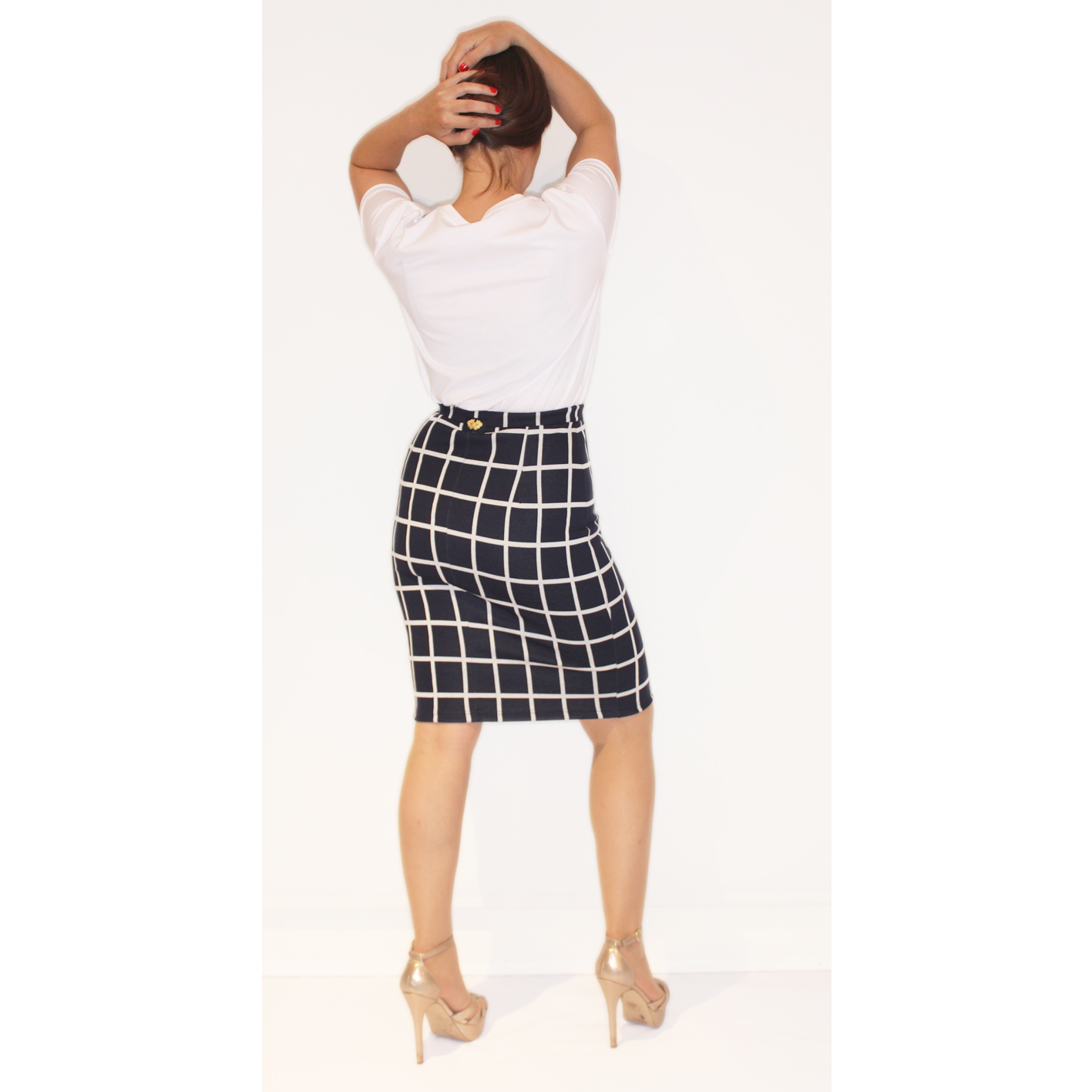 Navy pencil skirt with big grating pattern.