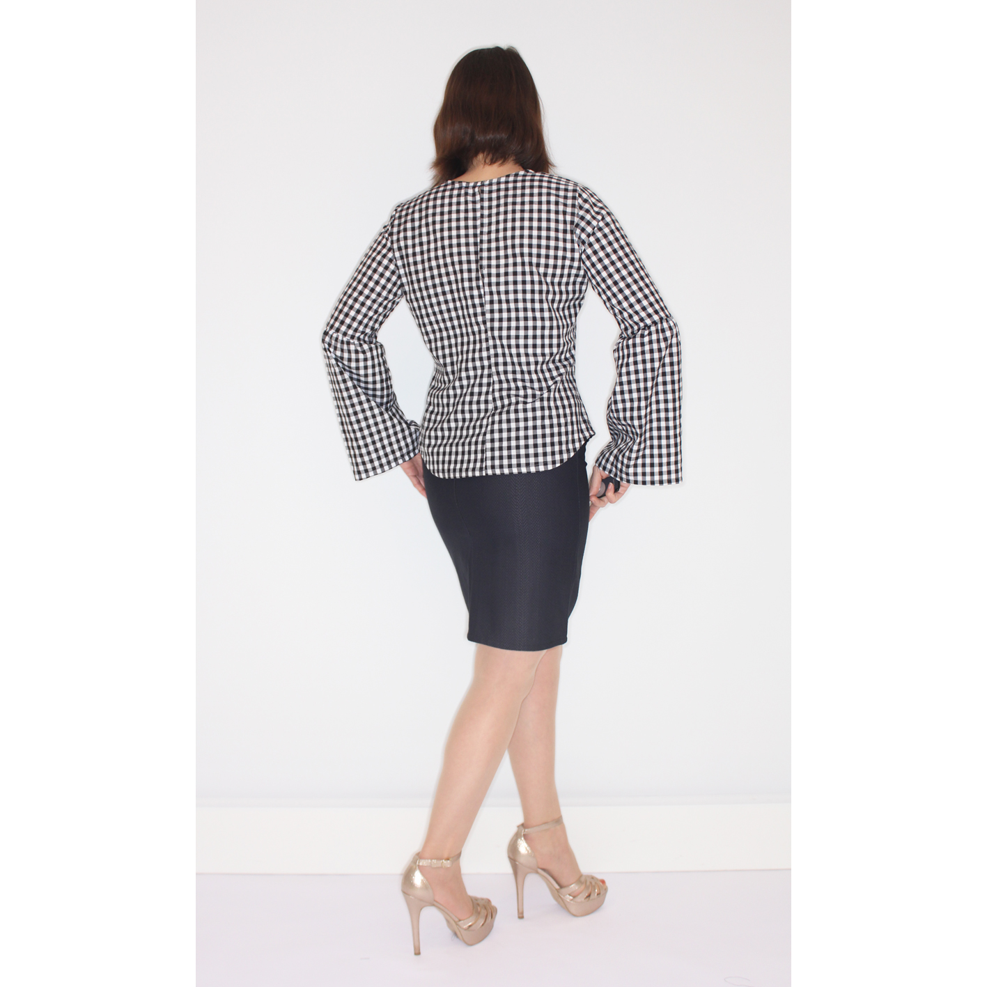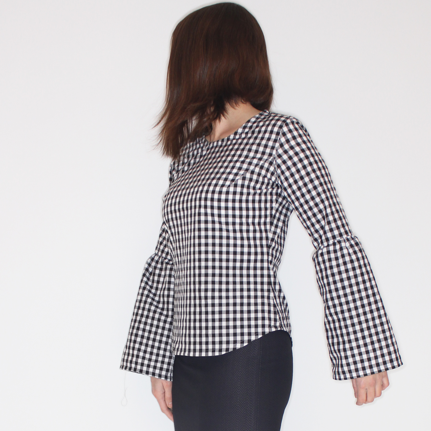 Shaped top with puffy sleeves. At the midback there is a 20cm opening.
