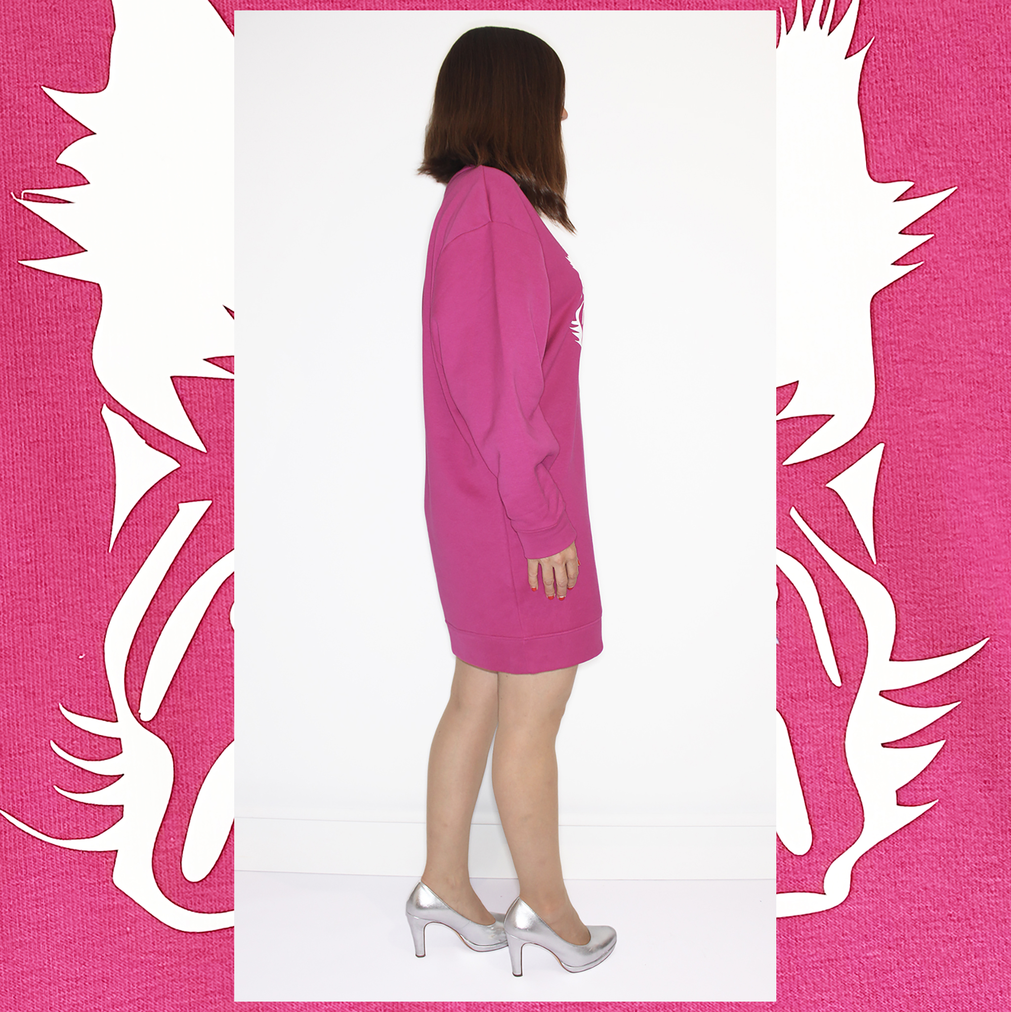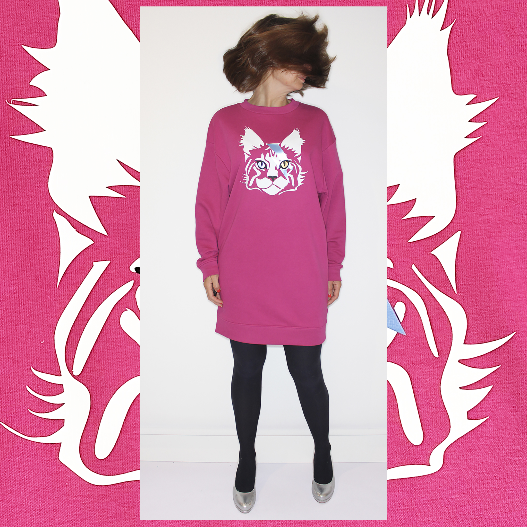 Bowie the Cat is back! This pink sweater dress, crafted from soft organic cotton,