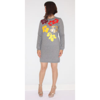 This sweater dress is exceptionally soft inside and out, with a high neckline for extra comfort. The sleeves taper from wide to fitted at the wrist. Available in a medium fit, it is made of 70% cotton and 30% polyester. The cat print incorporates various colored foils with glittery green eyes.