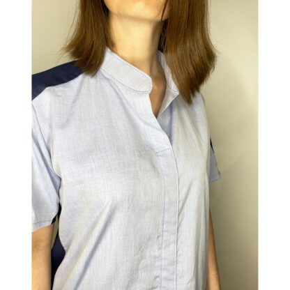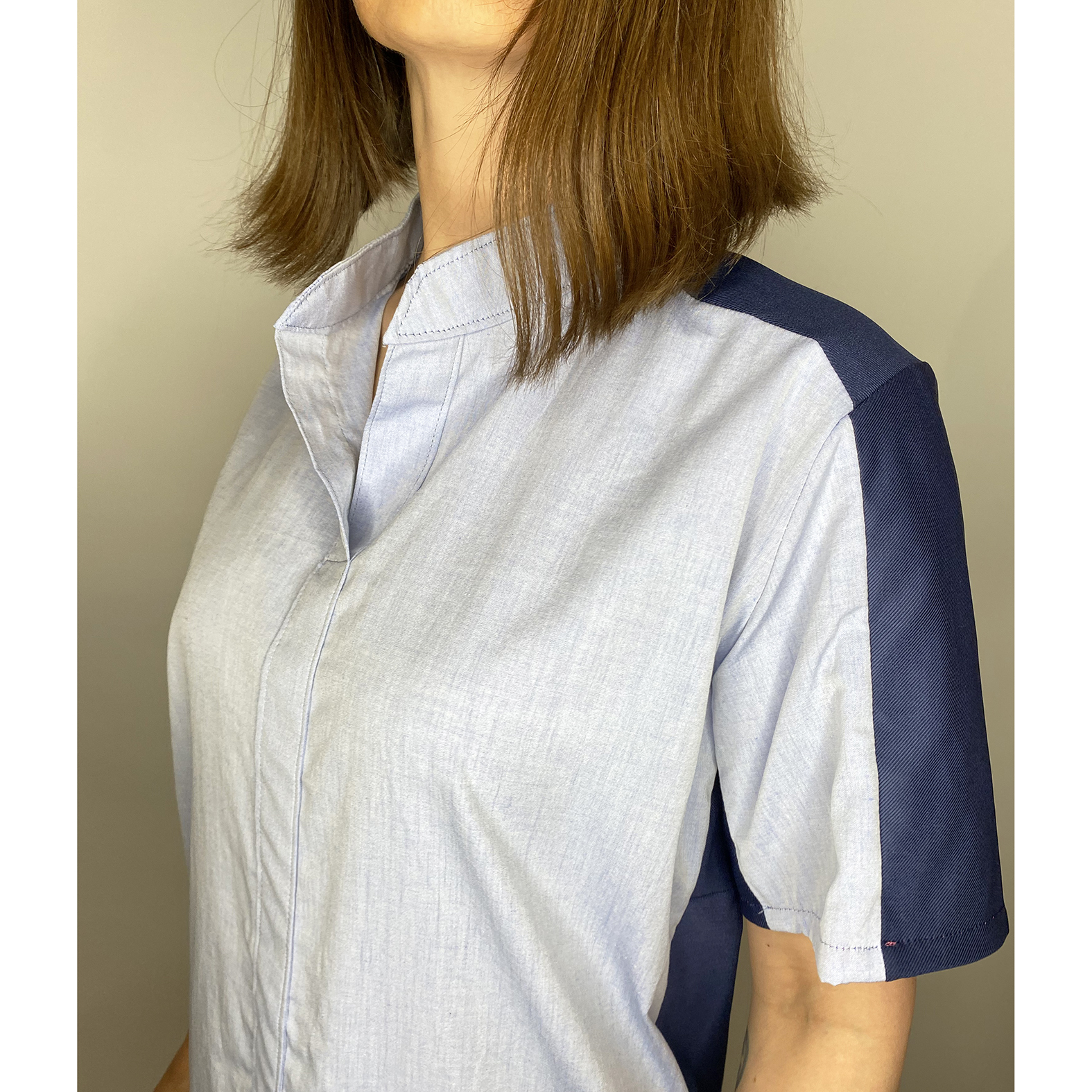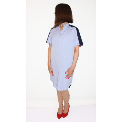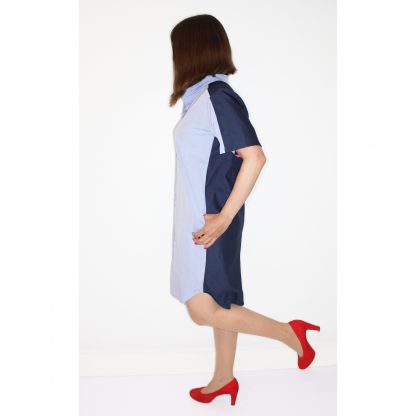 Front light blue shirt cotton and the back side of the dress is a navy shirt cotton.