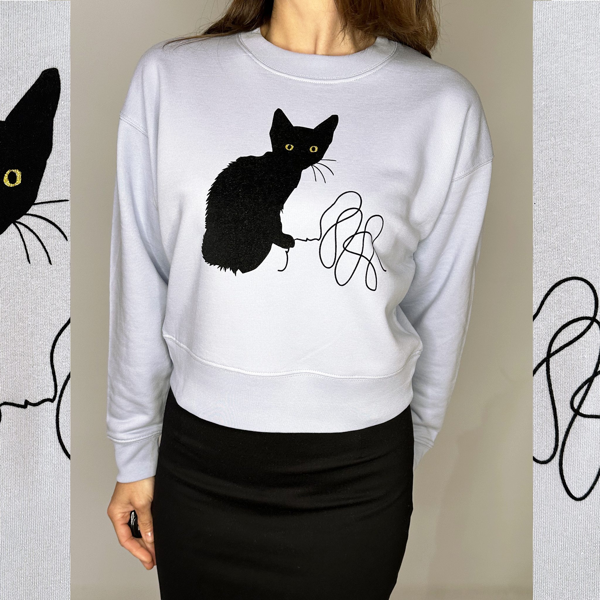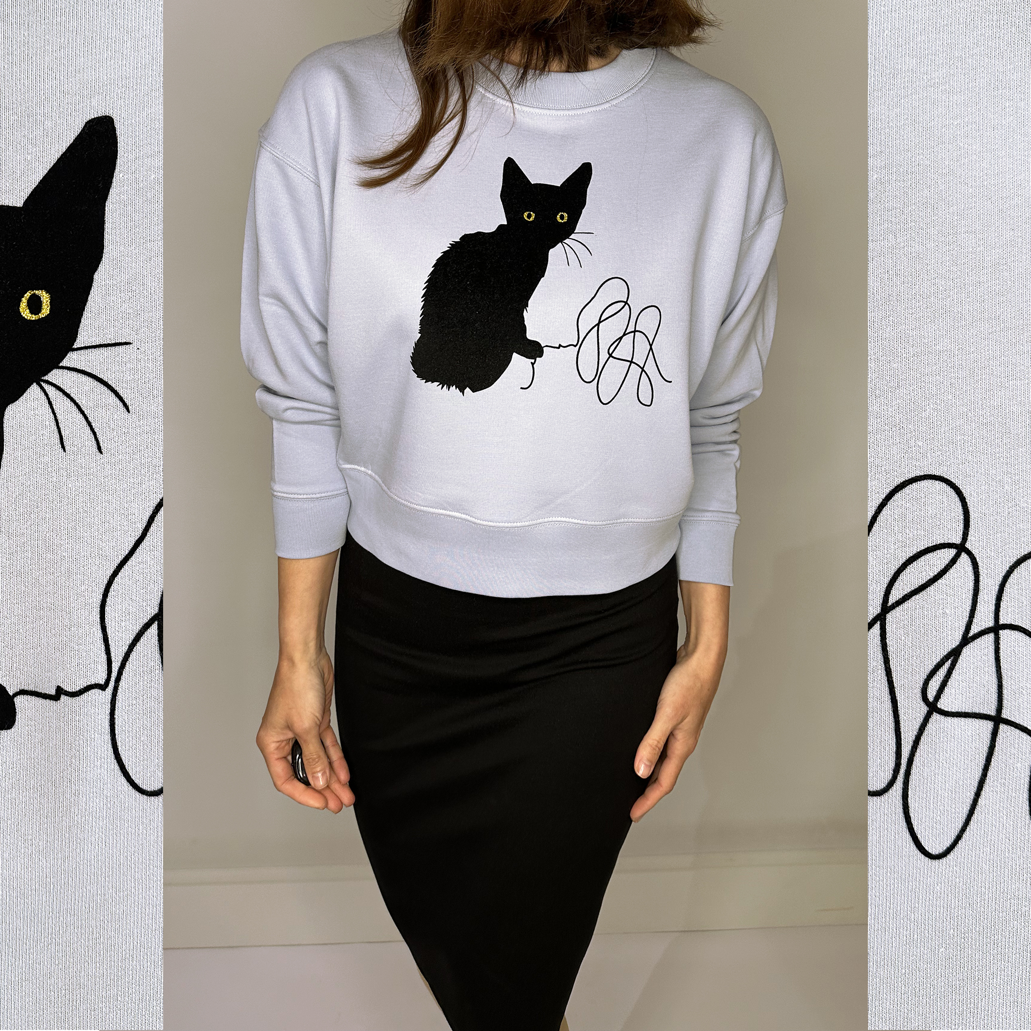 crafted from organic cotton and adorned with a black velvet kitten, complete with golden glitter eyes.