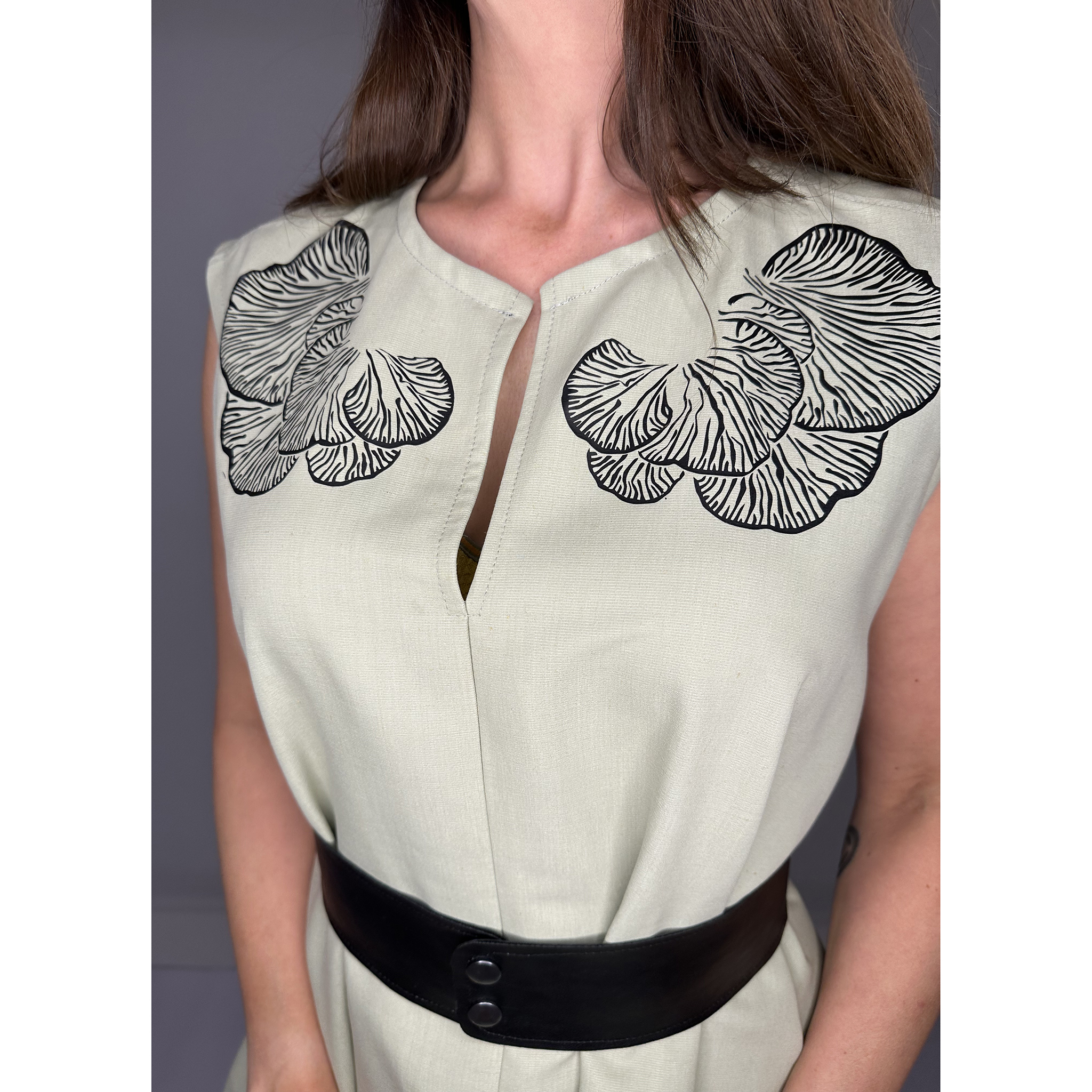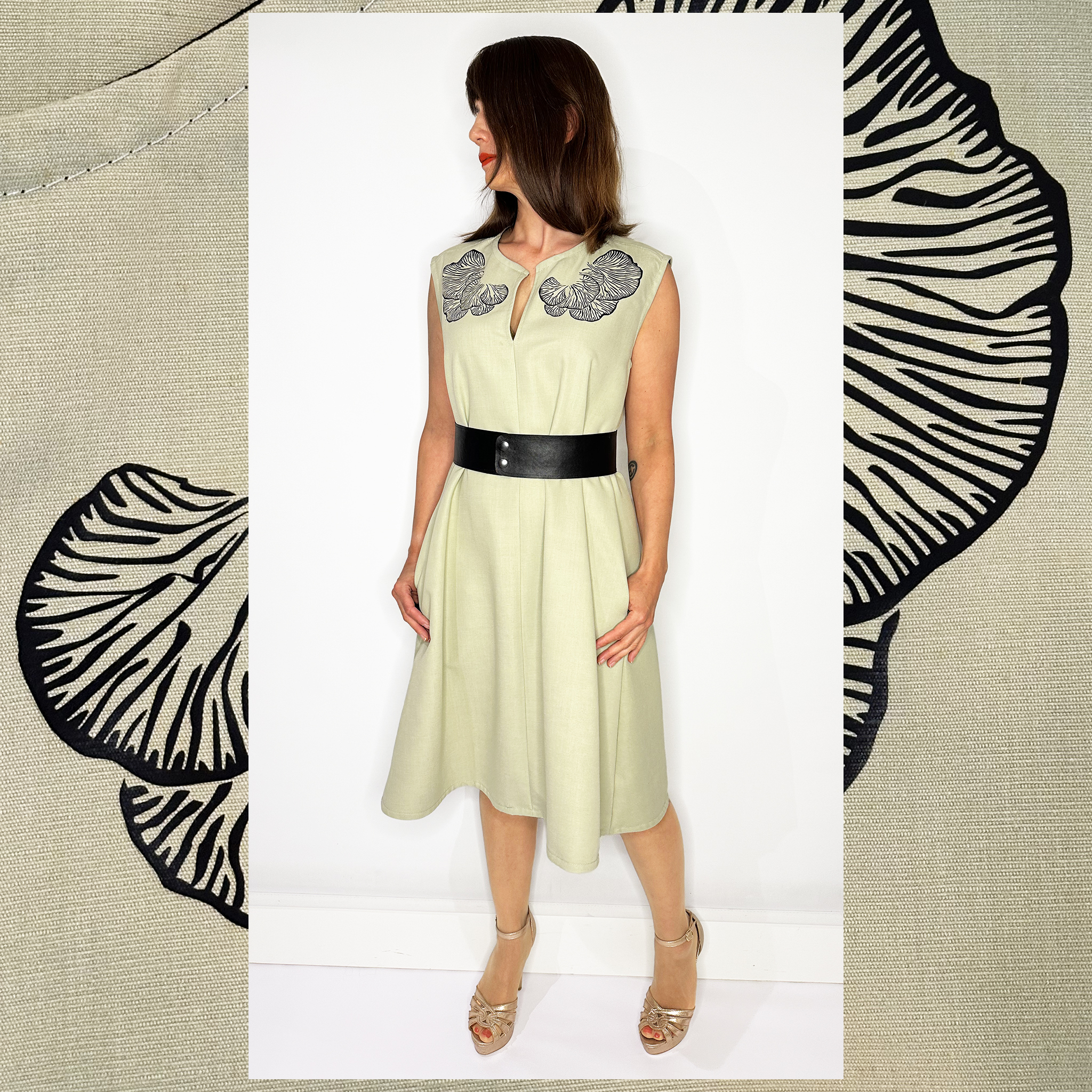 This sleeveless dress blends timeless elegance with family heritage, inspired by the soft,