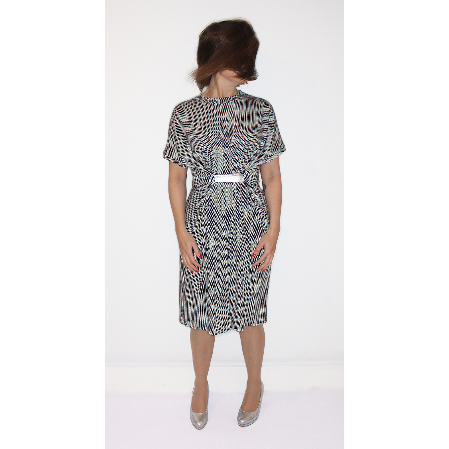 Flowy black and white dress with silver sewn in belt.