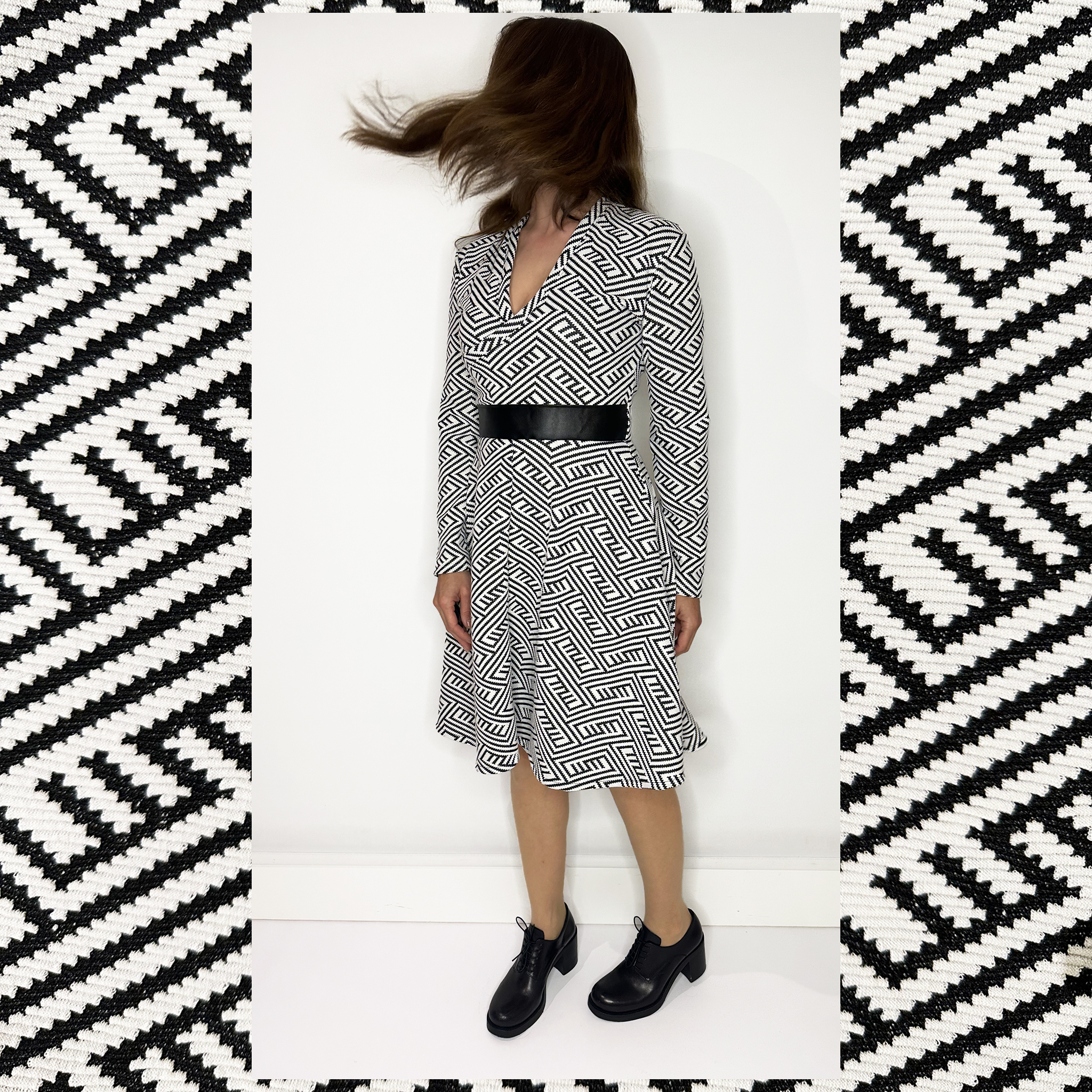 Discover Studio Catta’s Geometric Wrap Dress—an elegant blend of bold jacquard knit and a chic vegan leather belt.