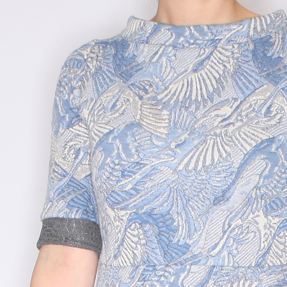 Jaqcuard knit of polyester and lurex. Easy fit and wash.