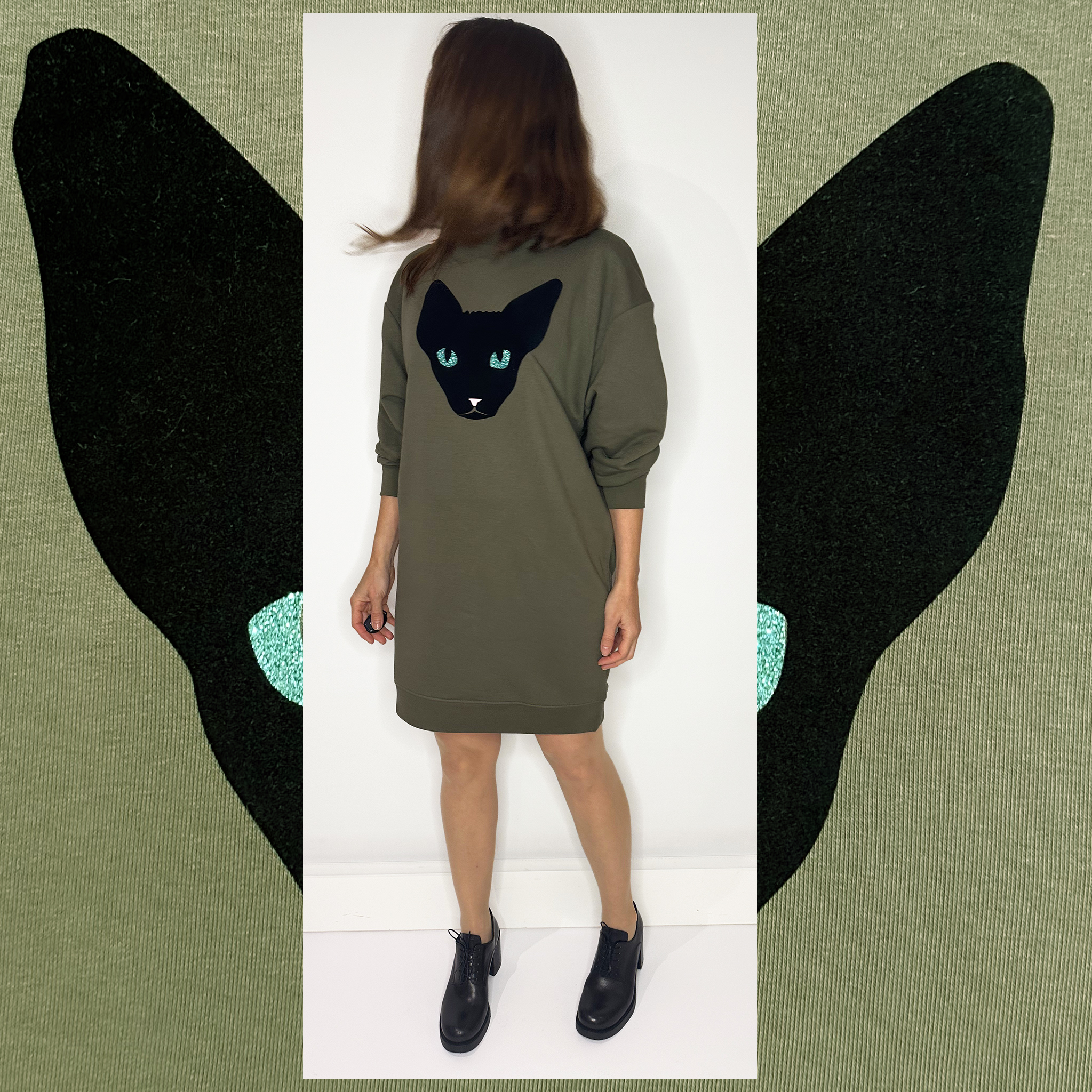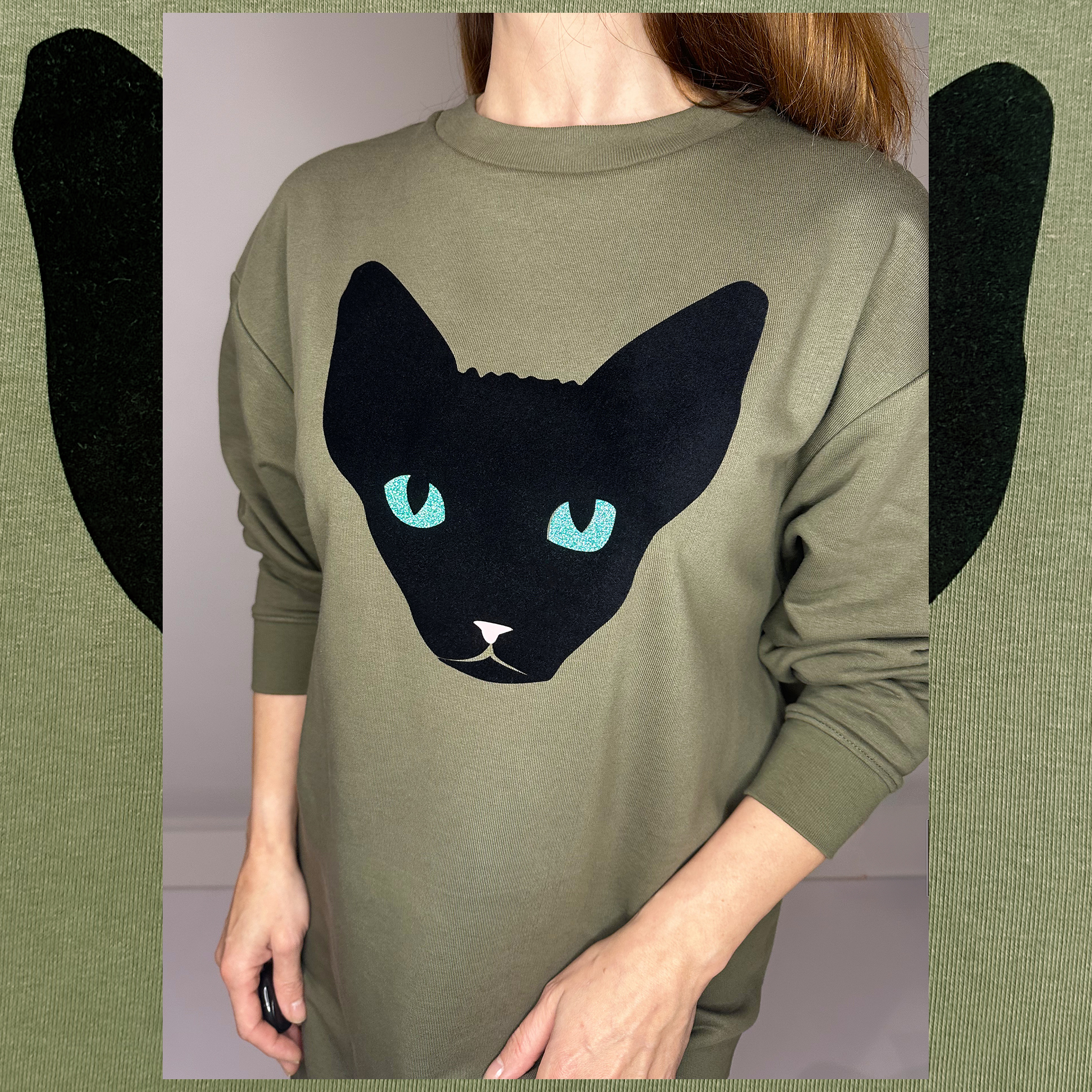 Crafted from organic cotton and Fair Wear-certified, this forest green long sweater features a unique cat print—made with luxurious black velvet foil and adorned with glittering green eyes for a striking finish.