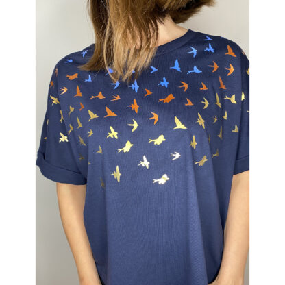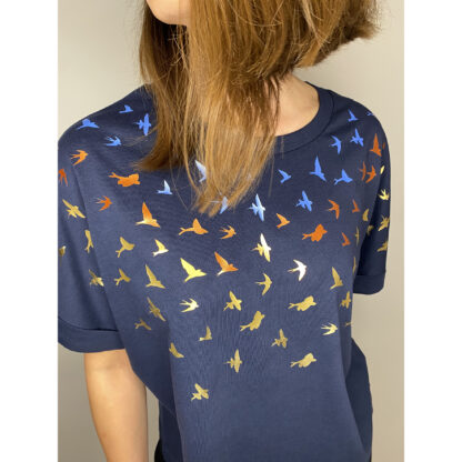 Swallows and flying fish sprinkled on a wide organic cotton navy shirt.
