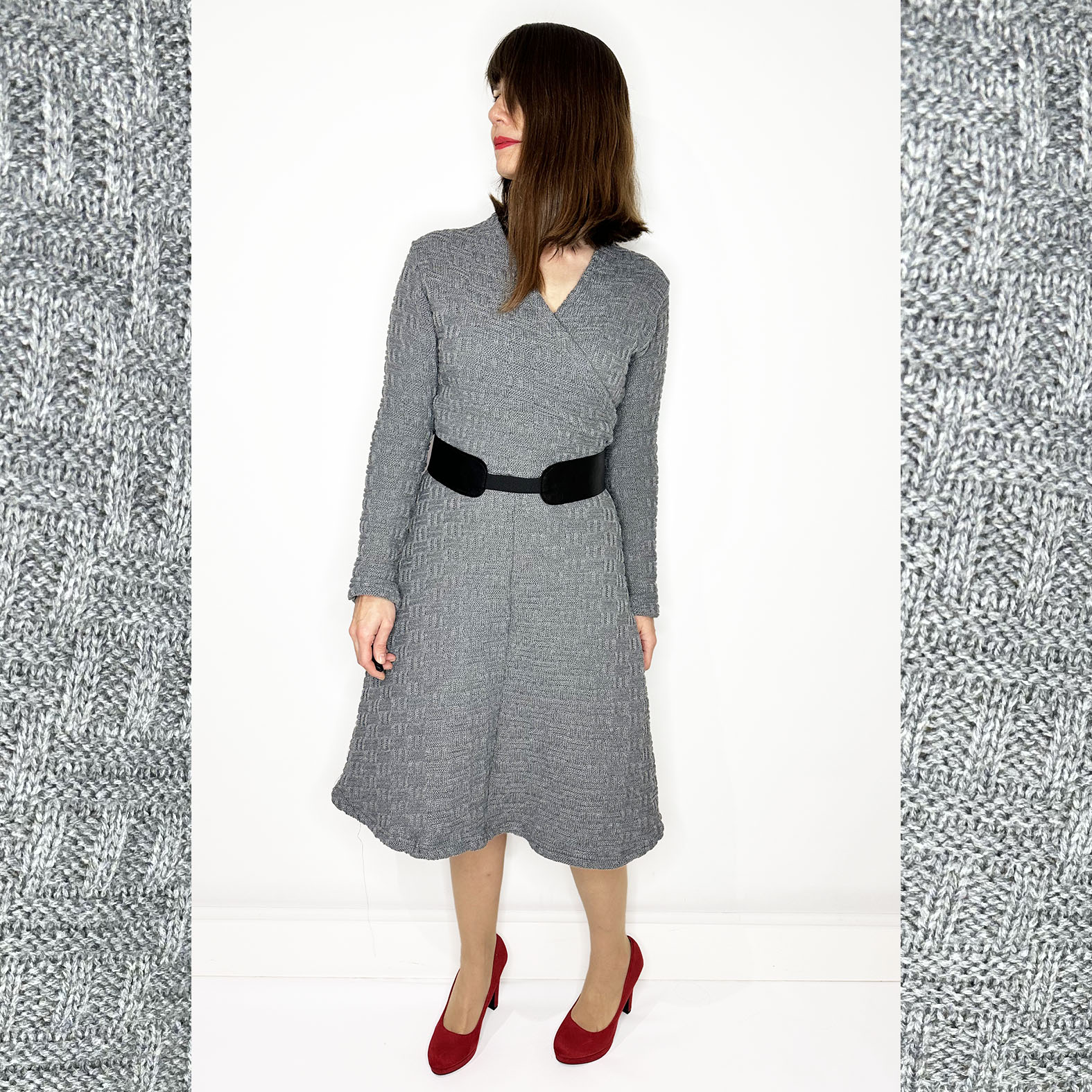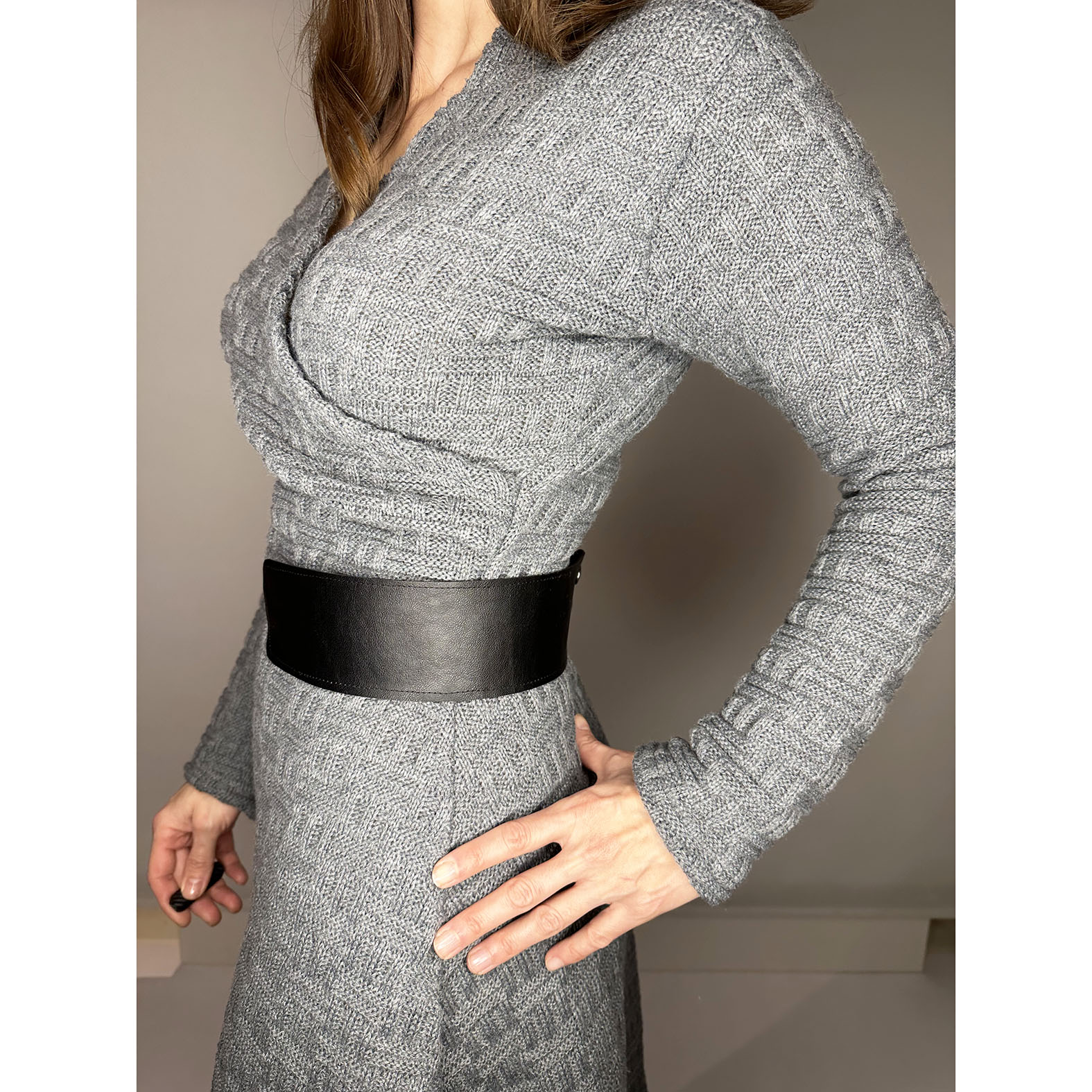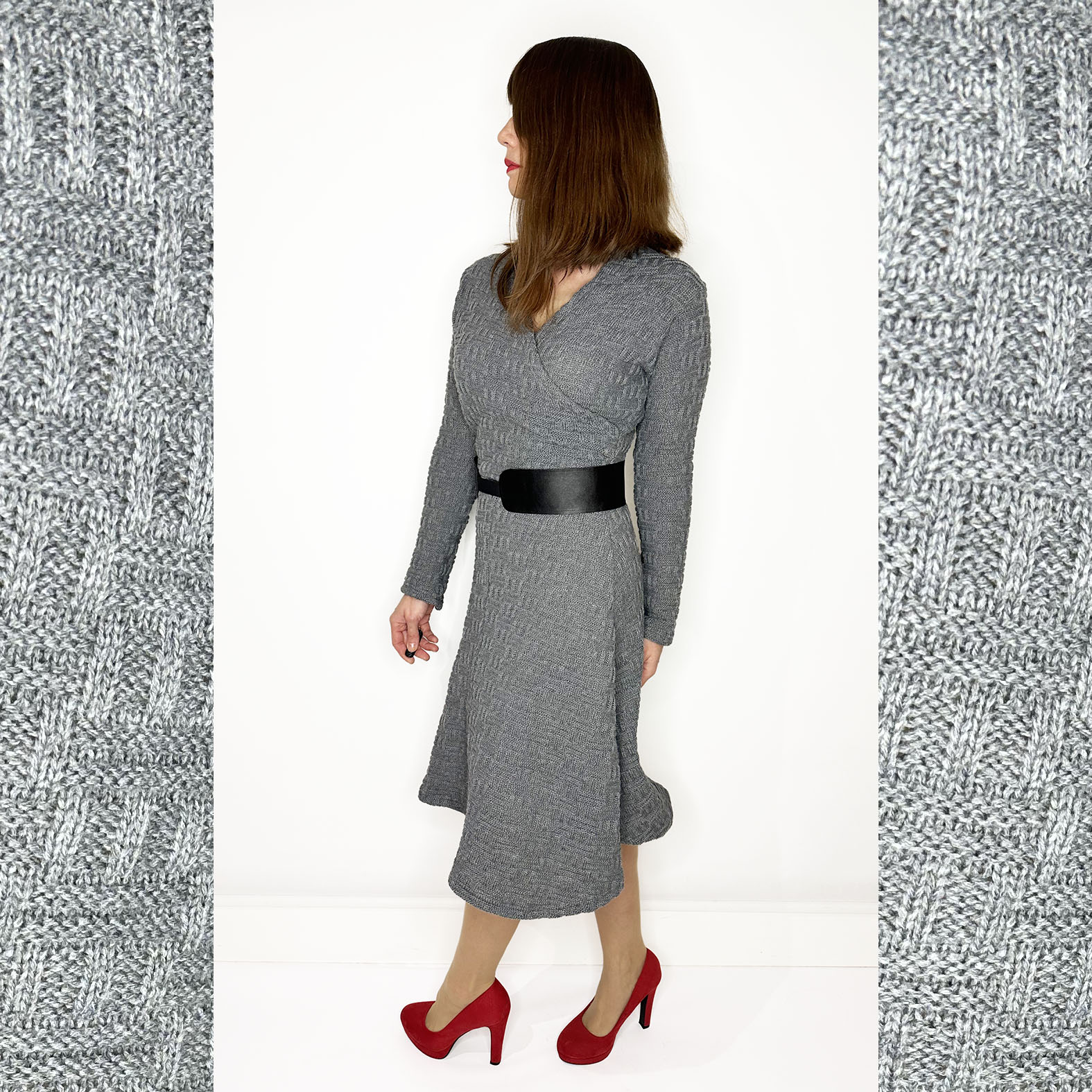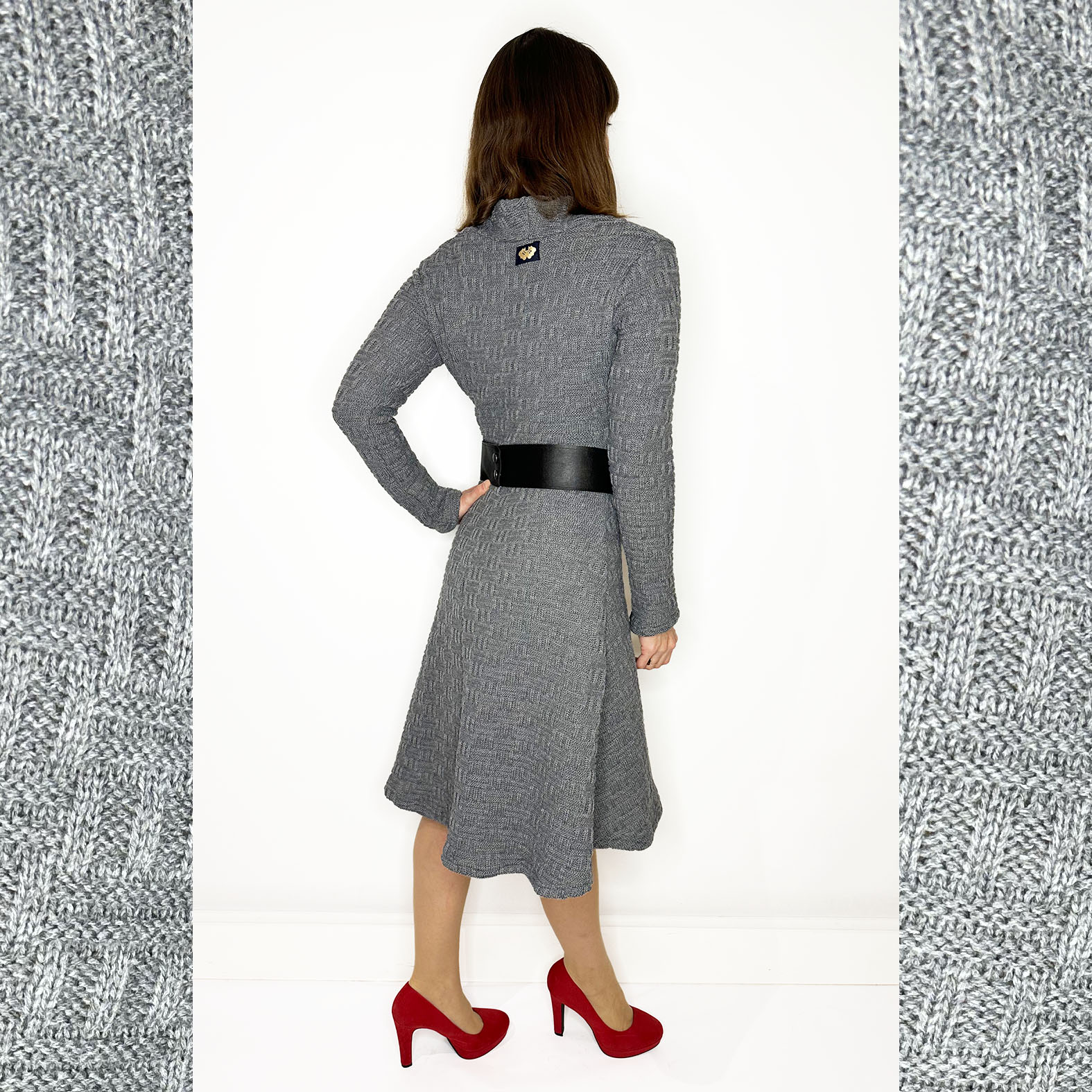 Discover the charm of Slowfashion Amsterdam with our warm grey chunky knit dress, complemented by a sleek black vegan belt.