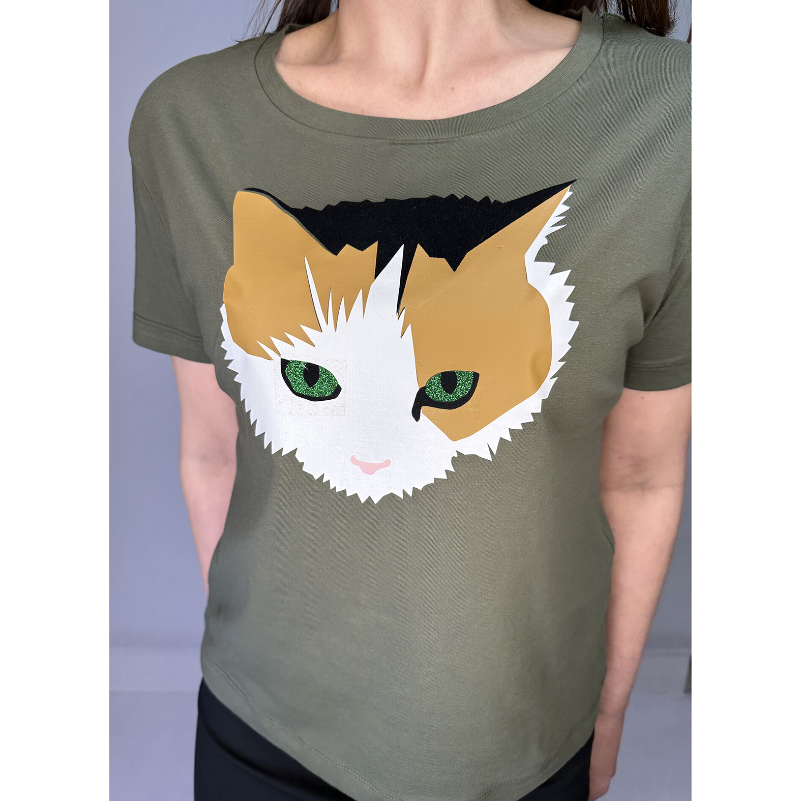 Get whiskered away in style with our Khaki Organic Cotton Shirt featuring a playful calico cat print with shimmering green glitter eyes.