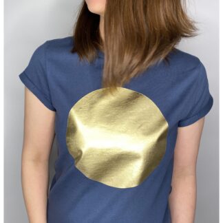 Organic cotton blue shirt with golden sun and rolled up sleeves